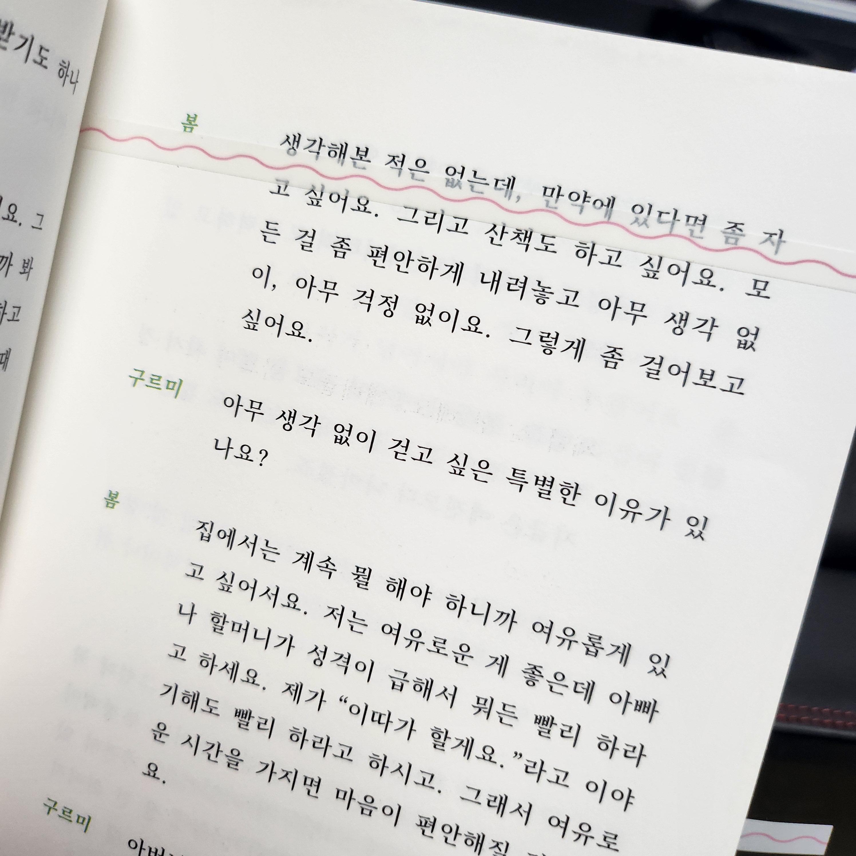 책에서 만난 봄, 진수, 동그라미, 샐쿵, 곰돌이, 라일라, 스간의 이야기는 지금 내 일상에 지쳐 있던 나의 뒤통수를 크게 한 대 때리는 것만 같았다. 각자의 자리에서 힘들게 살아가면서도 자신의 삶을 꿋꿋이 잘 견디며 살아가고 있는 이들의 이야기에 나는 같이 울고, 웃고, 공감하며 감사하고 미안한 마음으로 책을 읽어갔다. 그중 가장 기억에 남는 이야기들을 발췌했다.